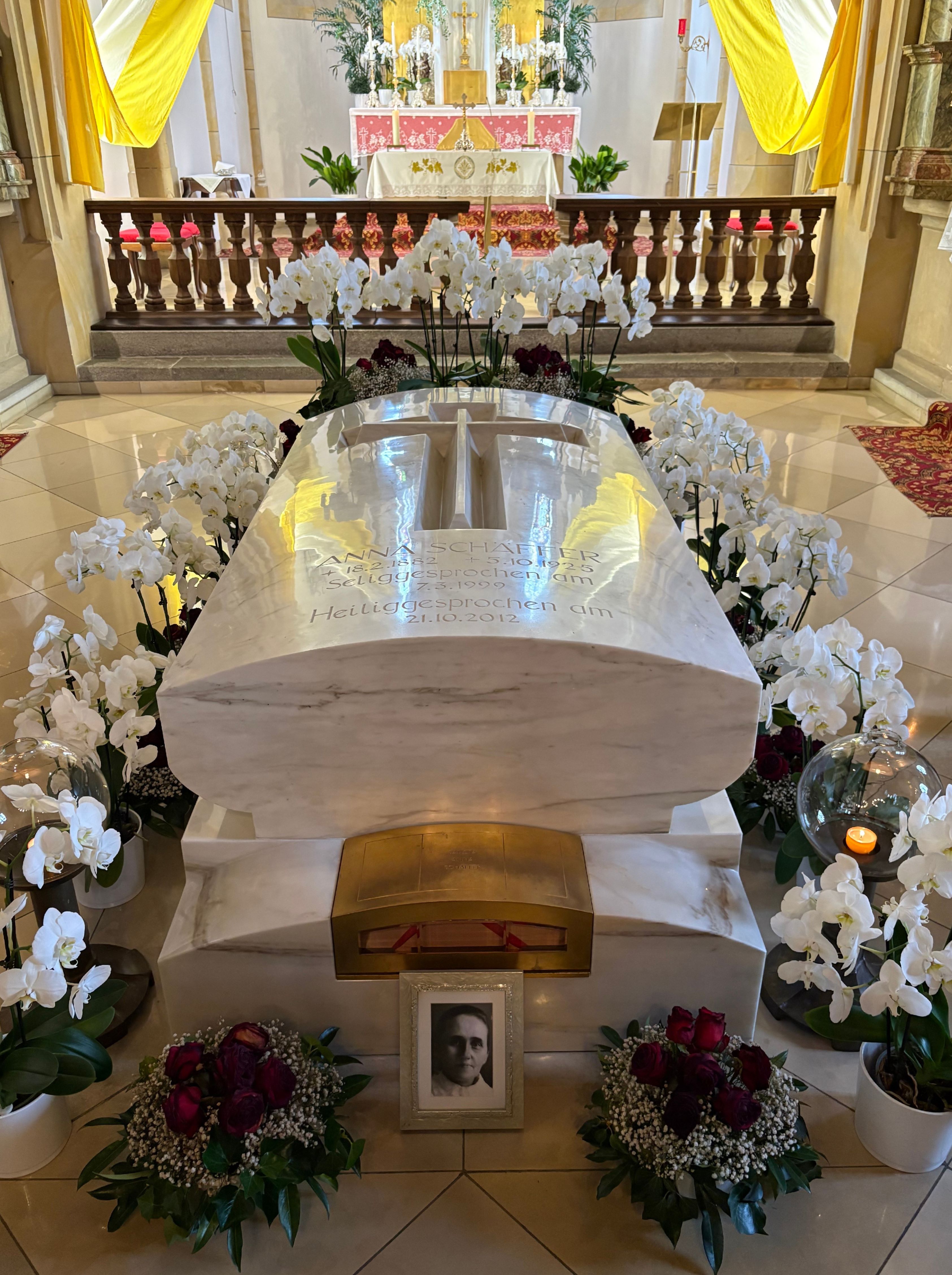 Erste Station war Mindelstetten, der Heimatort der heiligen Anna Schäffer. Pfarrer Schemmerer führte in das Leben und die Spiritualität der Heiligen ein, deren tiefes Vertrauen auf Gott vielen Menschen ein Vorbild wurde. In der Pfarr- und Wallfahrtskirche, dem Diözesanheiligtum der Heiligen, feierten die Hausgemeinschaft eine Votivmesse zu Ehren der heiligen Anna Schäffer. Im Anschluss sah die Gruppe einen Film über ihr Leben und besichtigte das Geburtshaus der Heiligen.