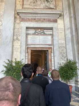 Am Montag, den 24. Februar 2025, begannen wir den Tag mit einer Messe mit Kardinal Müller in den Grotten des Petersdoms. Nach der Messe durchschritten wir wieder nach einem kleinen Impuls die Heilige Pforte am Petersdom und es schloss sich eine Führung durch den Regens an. Nach der gemeinsamen Besichtigung gab es Zeit zur eigenständigen Besichtigung des Petersdoms. Ein Teil hat sich in das Umfeld des Vatikans begeben, um dort neben den Besichtigungen auch bei einem Espresso Land und Leute kennenzulernen. Ein anderer Teil hat die Kuppel bestiegen, um Rom auch von oben genießen zu können. Am Nachmittag trafen wir uns wieder zur Besichtigung der vatikanischen Archive mit dem Turm der Winde, auf dem unser heutiger Kalender berechnet wurde. Der restliche Tag war dann zur freien Gestaltung.